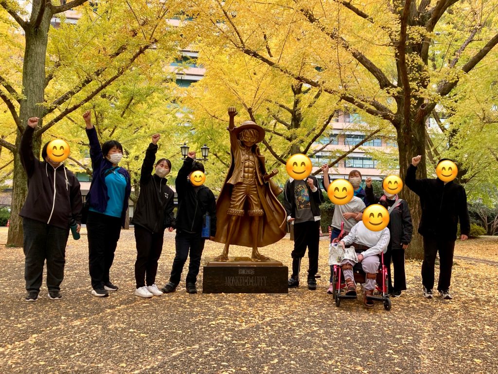 ワンピースの像の前でみんなで記念写真も撮りました。