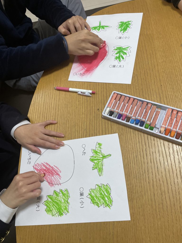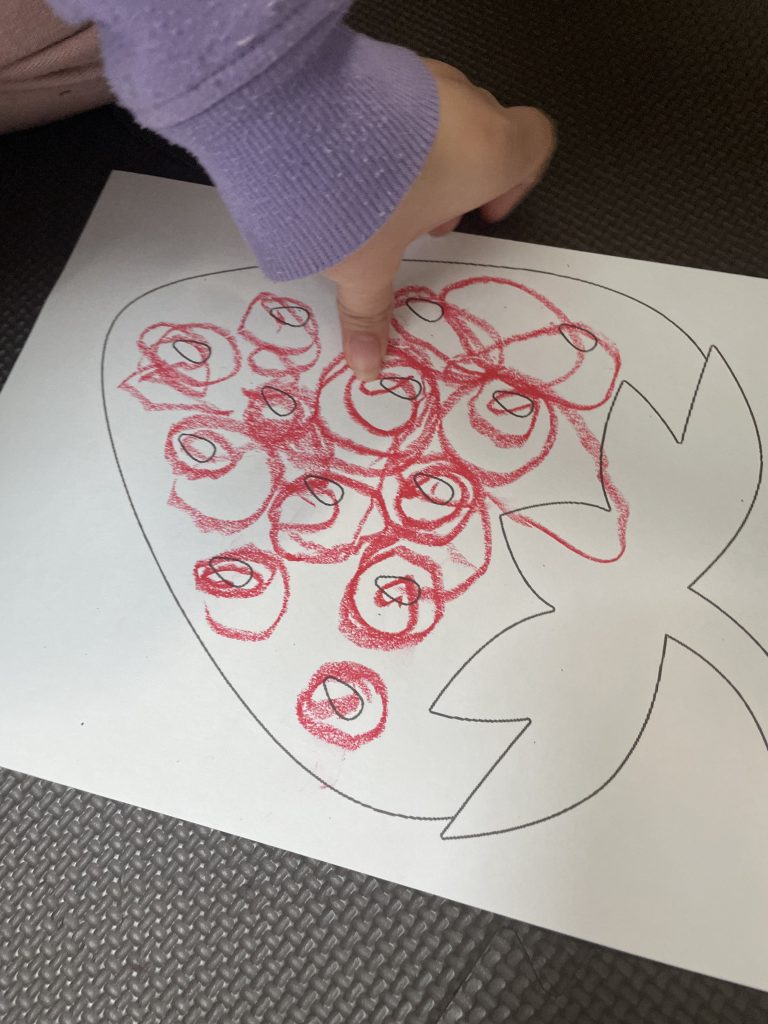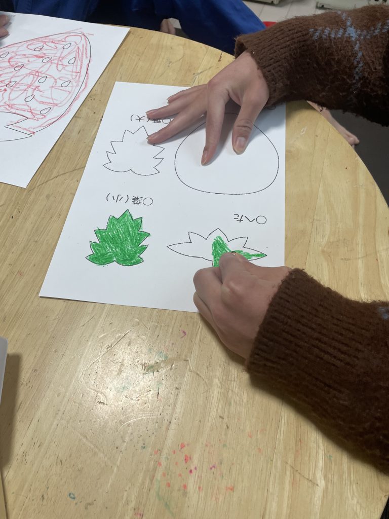 イチゴ🍓のイラストは、手先・指先を使いクレヨンで塗り
