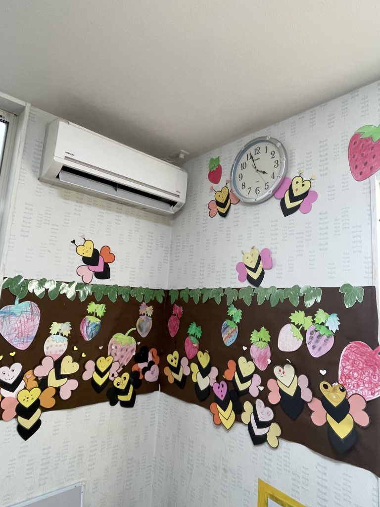 完成後貼り付けを行い、富士山からイチゴに変わり可愛い壁面の完成です。
