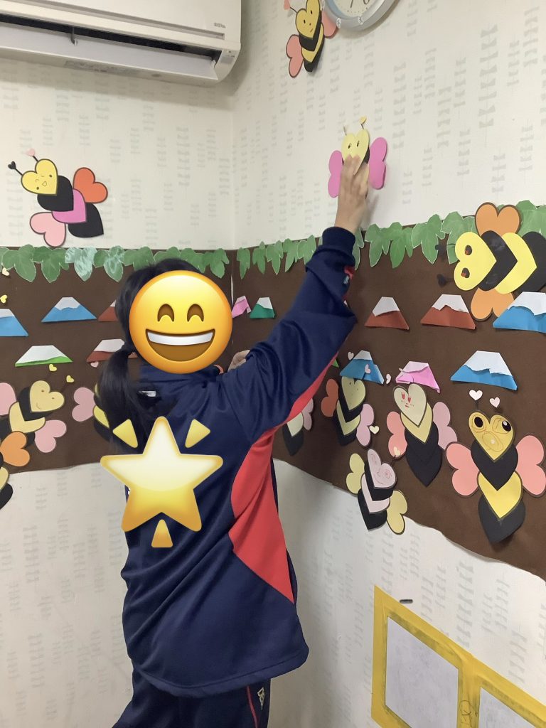 背の高い児童は、上の方に貼ったりと貼る場所も自分で決めてもらいました。