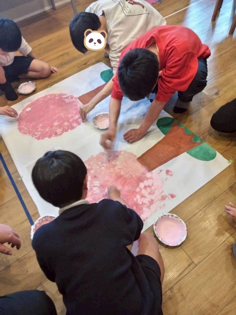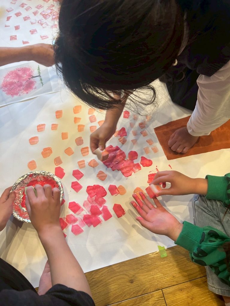 ポンポンと絵の具を沁み込ませたスポンジで綺麗な桜の花が咲きました🌸